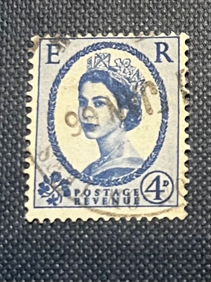 A cream and blue postage stamp featuring a portrait of Queen Elizabeth II, marked ‘E R’, ‘POSTAGE REVENUE’, and a face value of 4d.