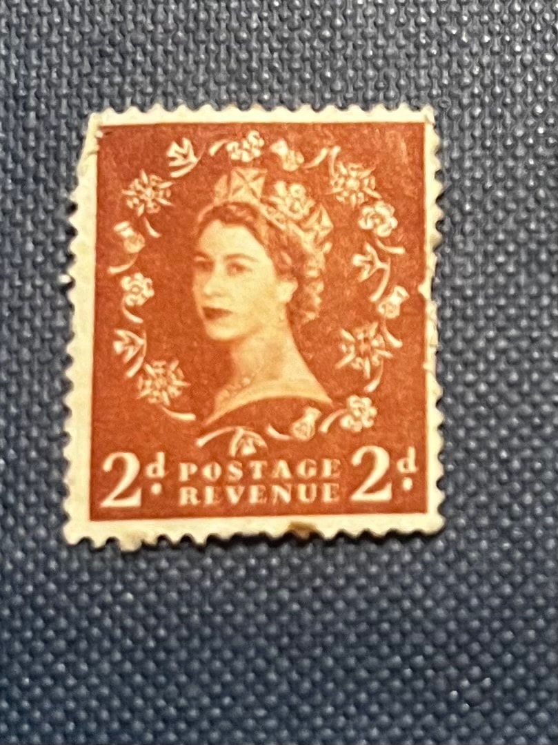 A reddish-brown Great Britain postage stamp featuring a portrait of Queen Elizabeth II, with ‘2^d’ and ‘POSTAGE REVENUE’ visible.