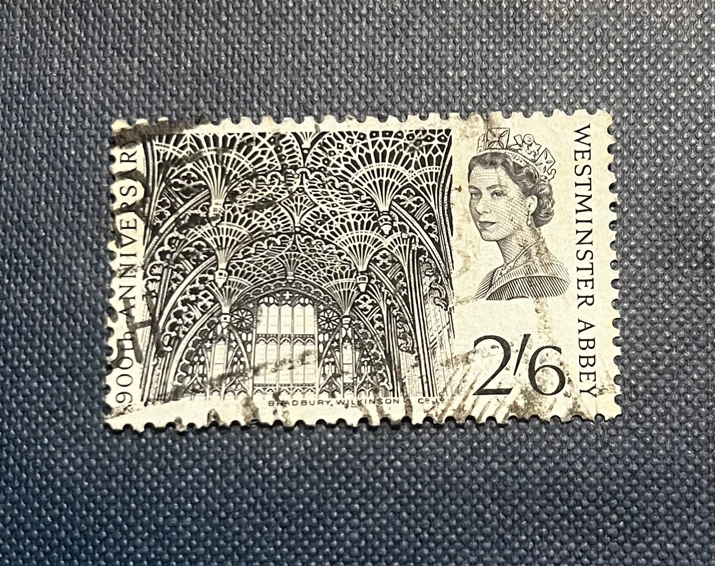 A 1966 Great Britain black and white postage stamp depicting Westminster Abbey and Queen Elizabeth II, inscribed ‘900th ANNIVERSARY’, ‘WESTMINSTER ABBEY’, and ‘BRADBURY, WILKINSON & Co LTD’, with a 2/6 denomination.
