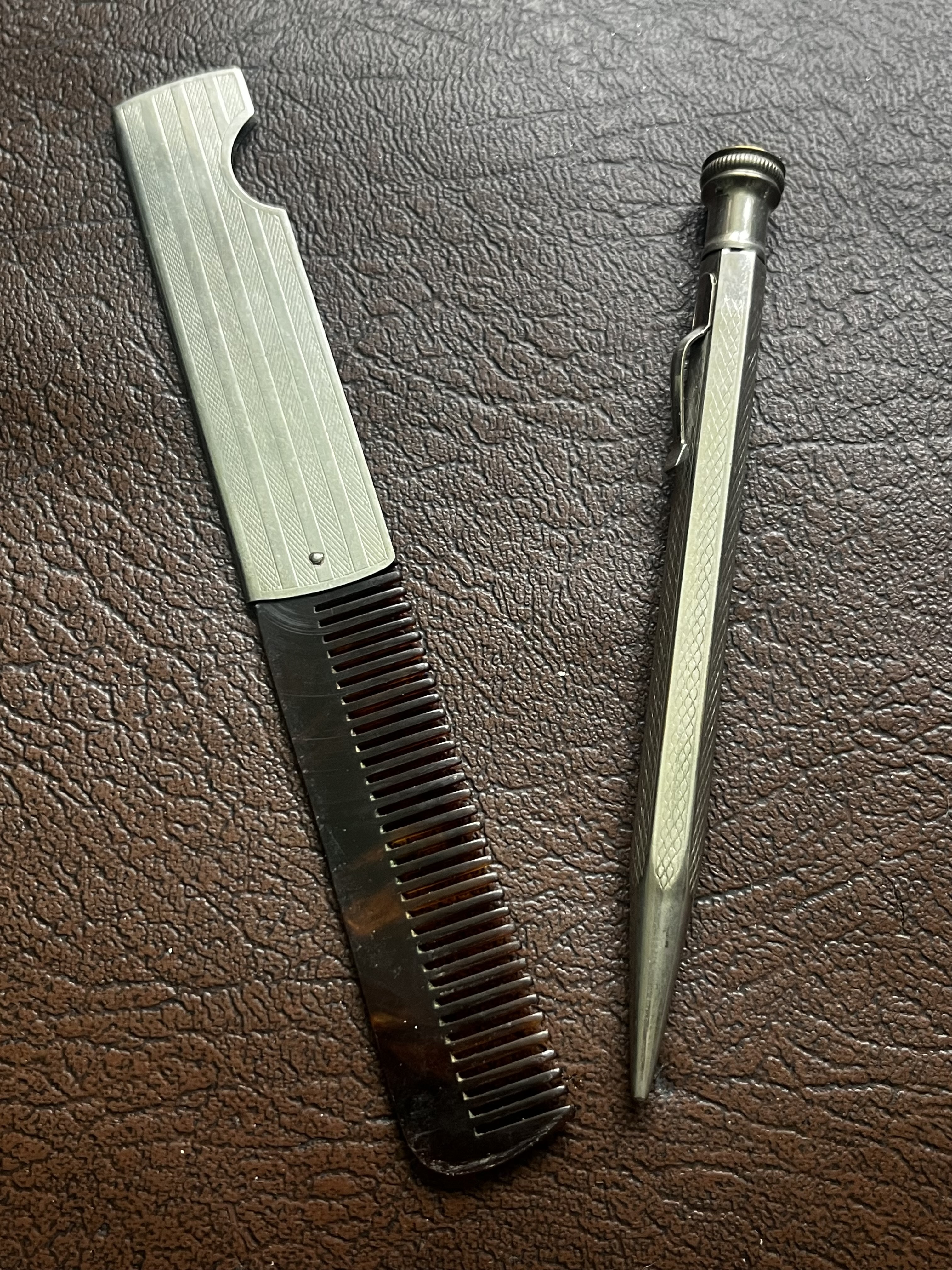 Propelling Pencil with hidden eraser & vintage folding wallet comb