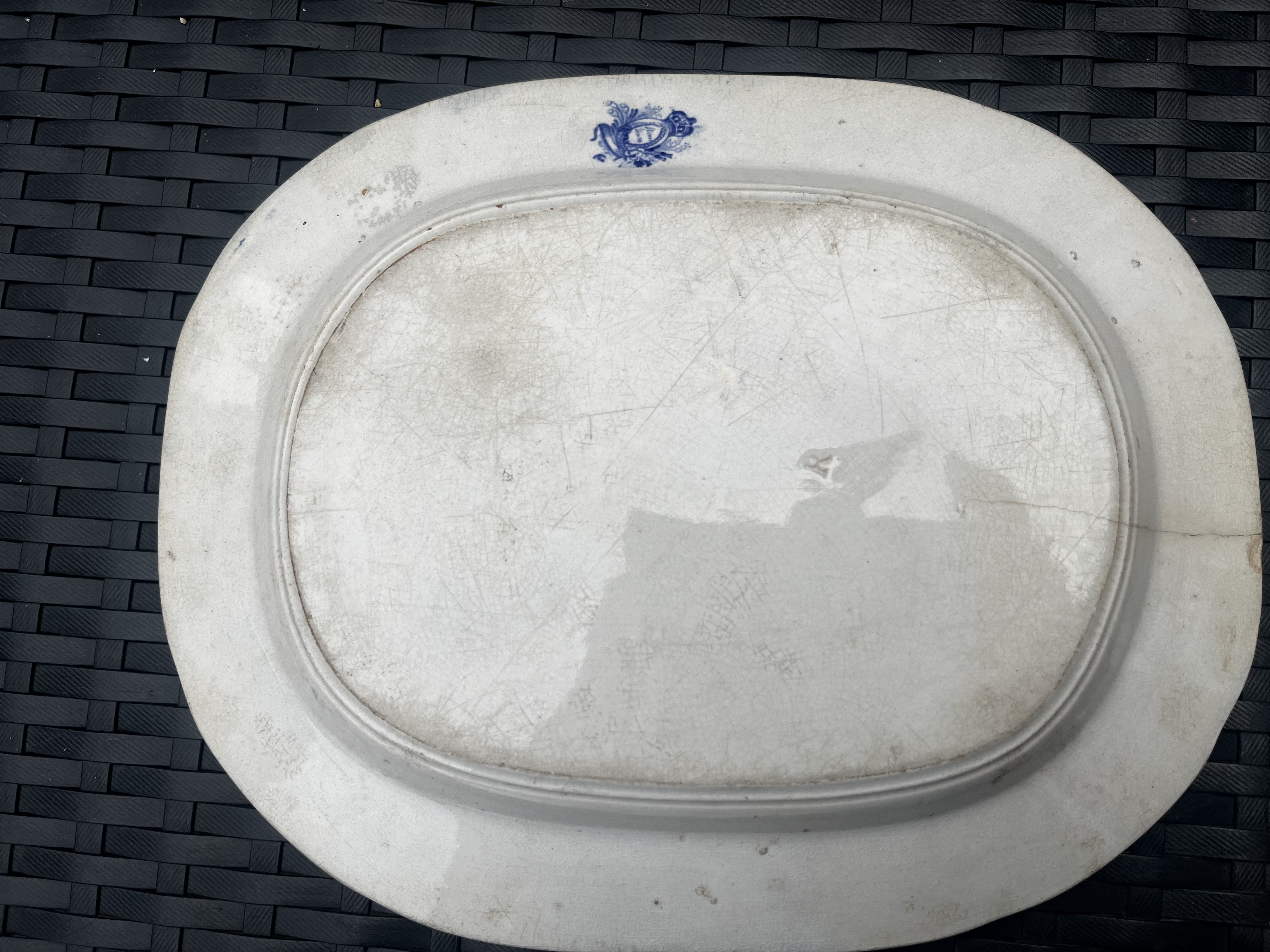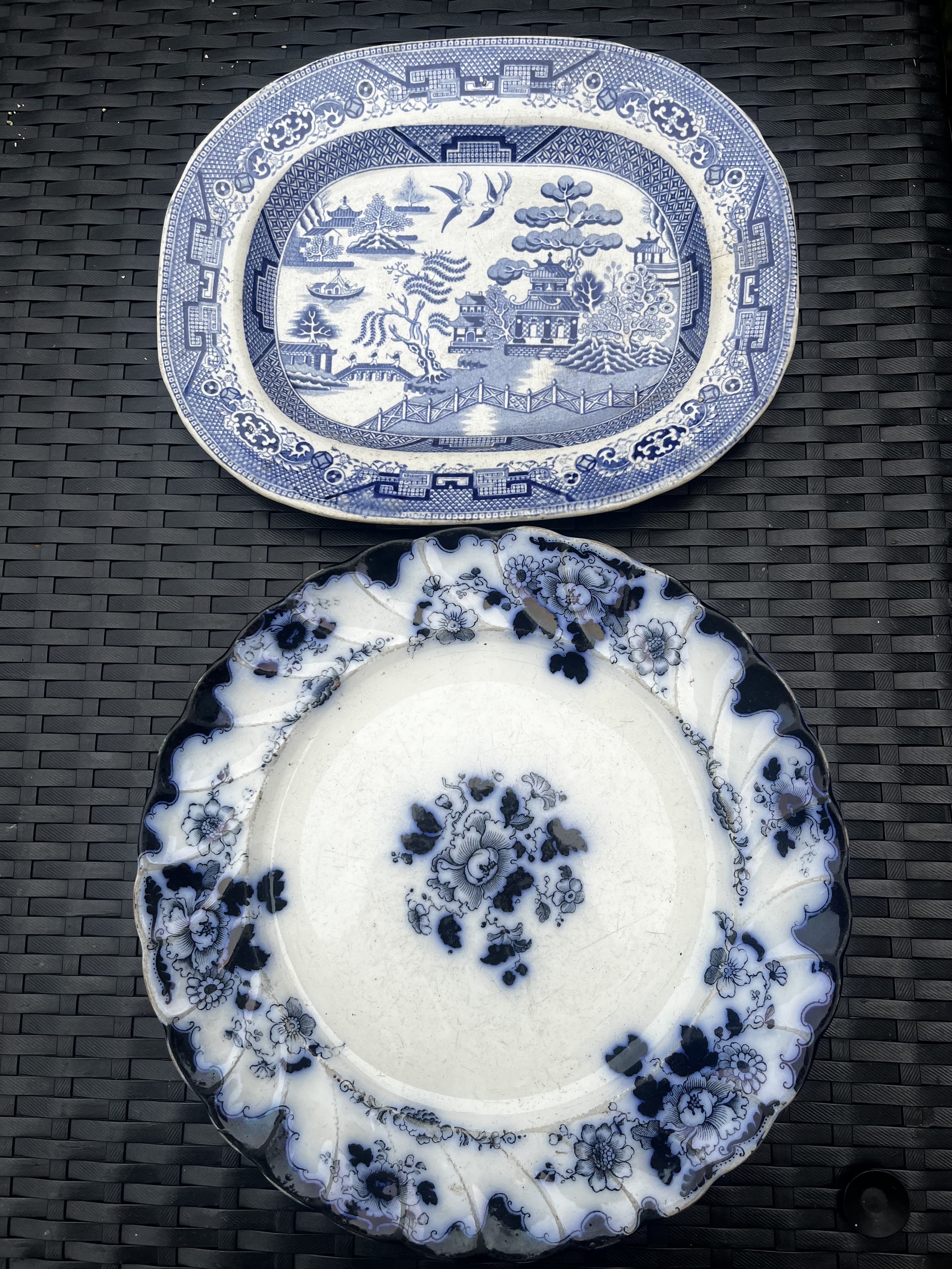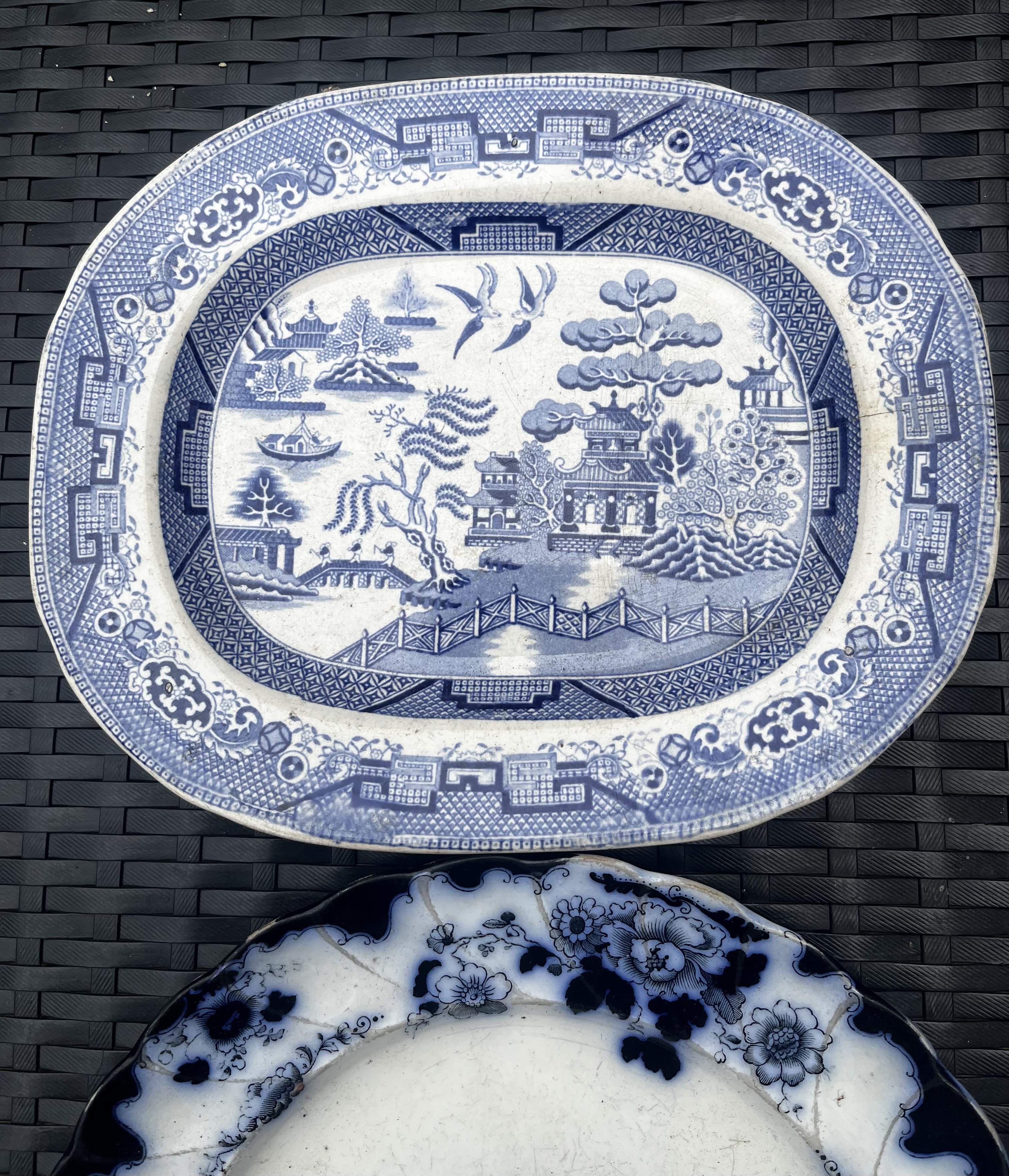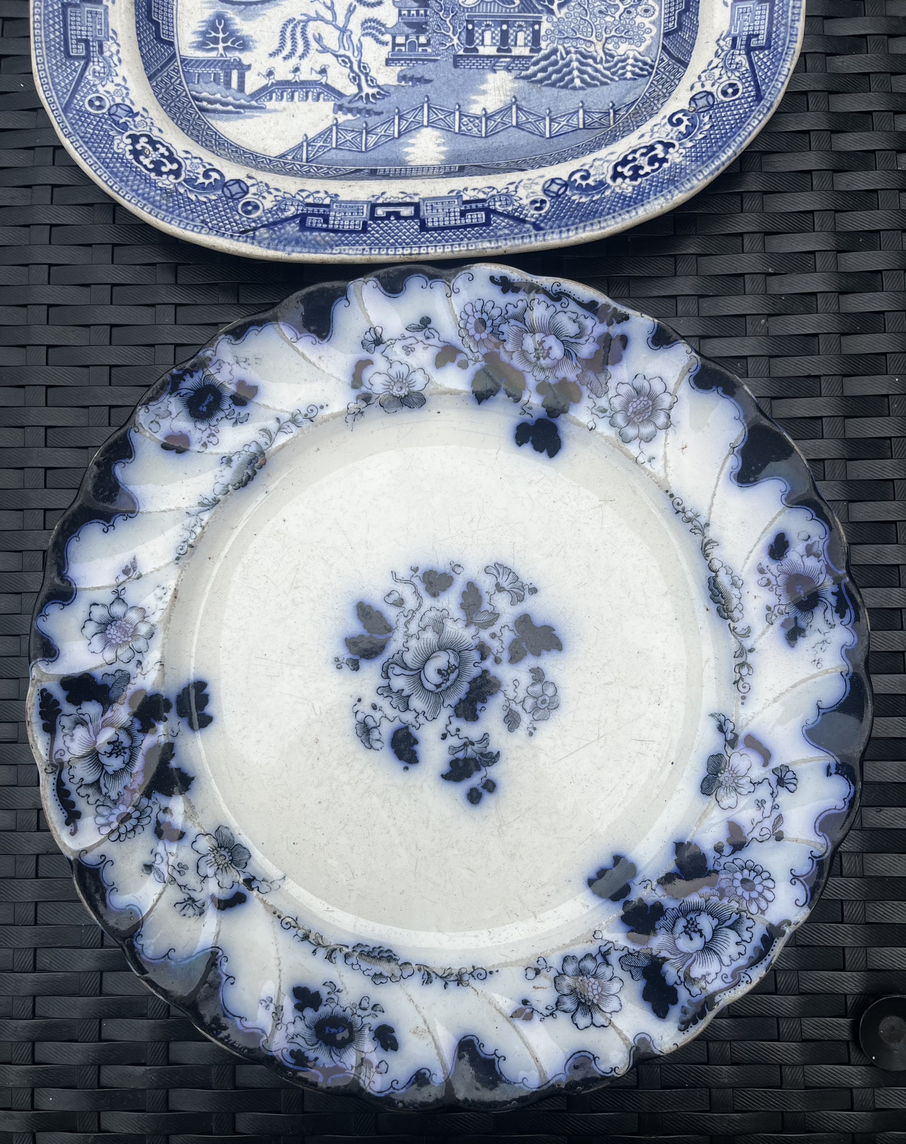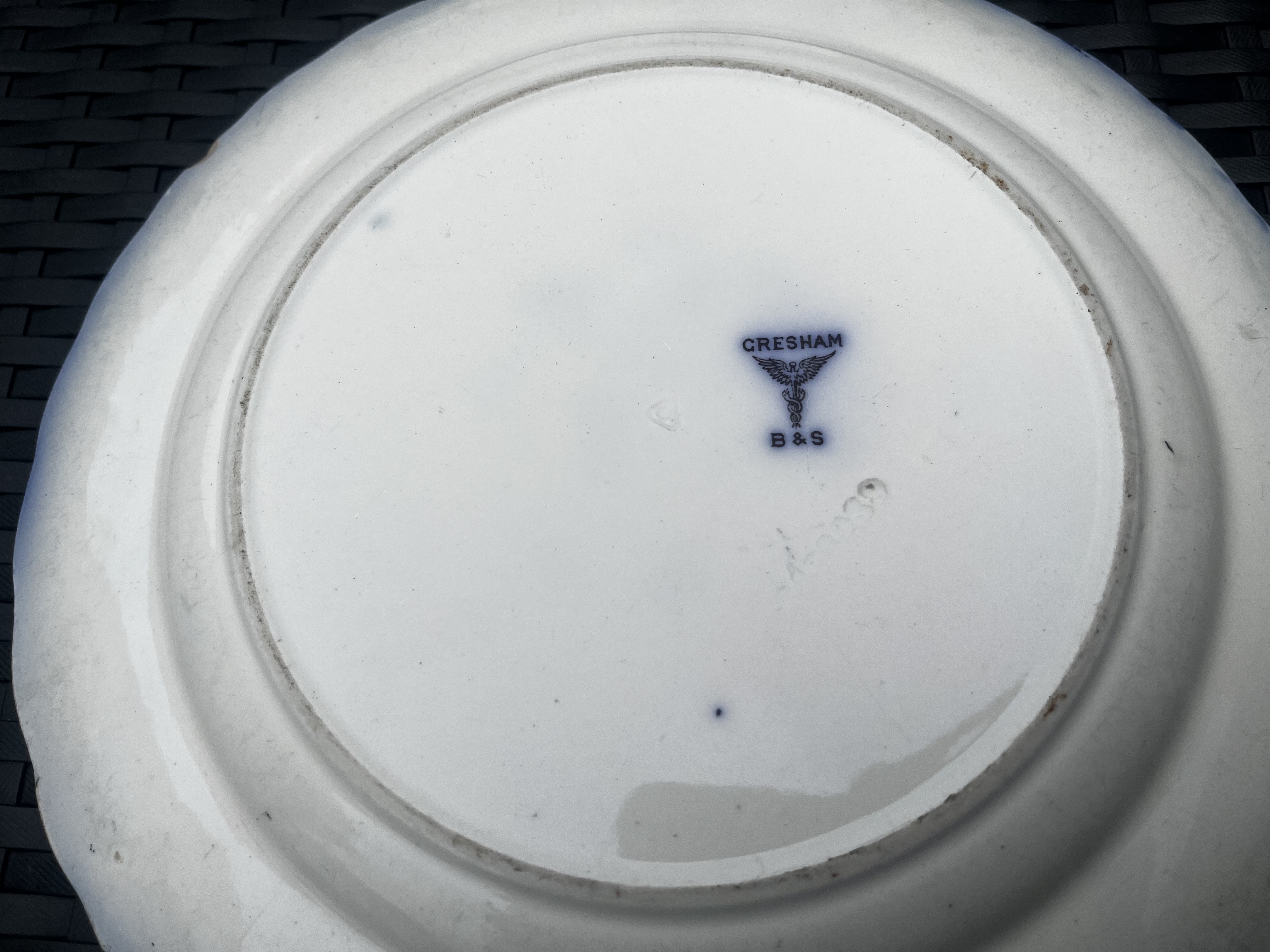 The top platter – a piece of Liberty Blue china features a classic Willow pattern, while the bottom plate has a flow blue pattern- backstamp on a Victorian-era Bishop & Stonier “Gresham” flow blue soup bowl