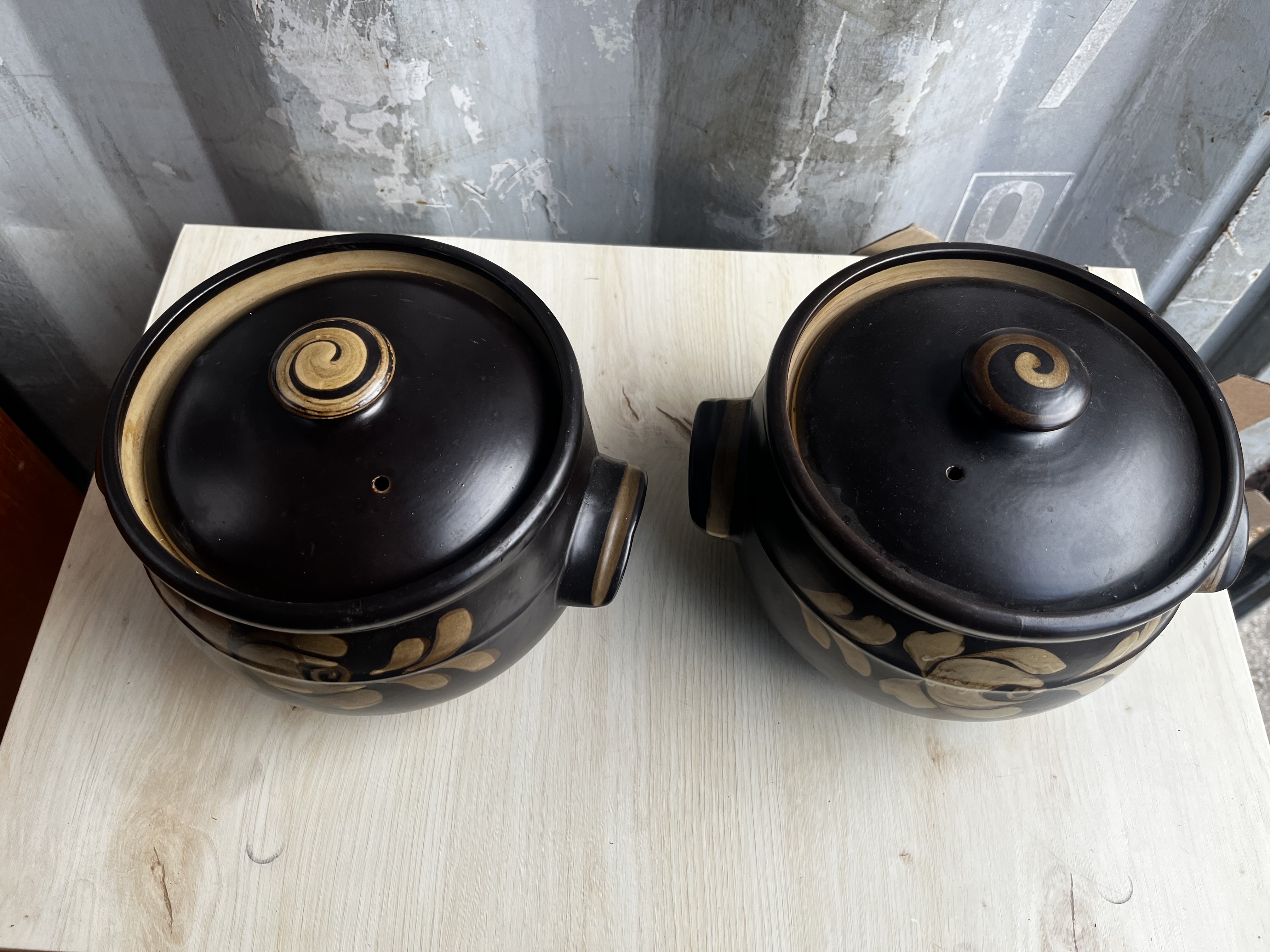 • Each dish features a rich, dark brown glaze with a stylised floral and leaf motif in ochre tones