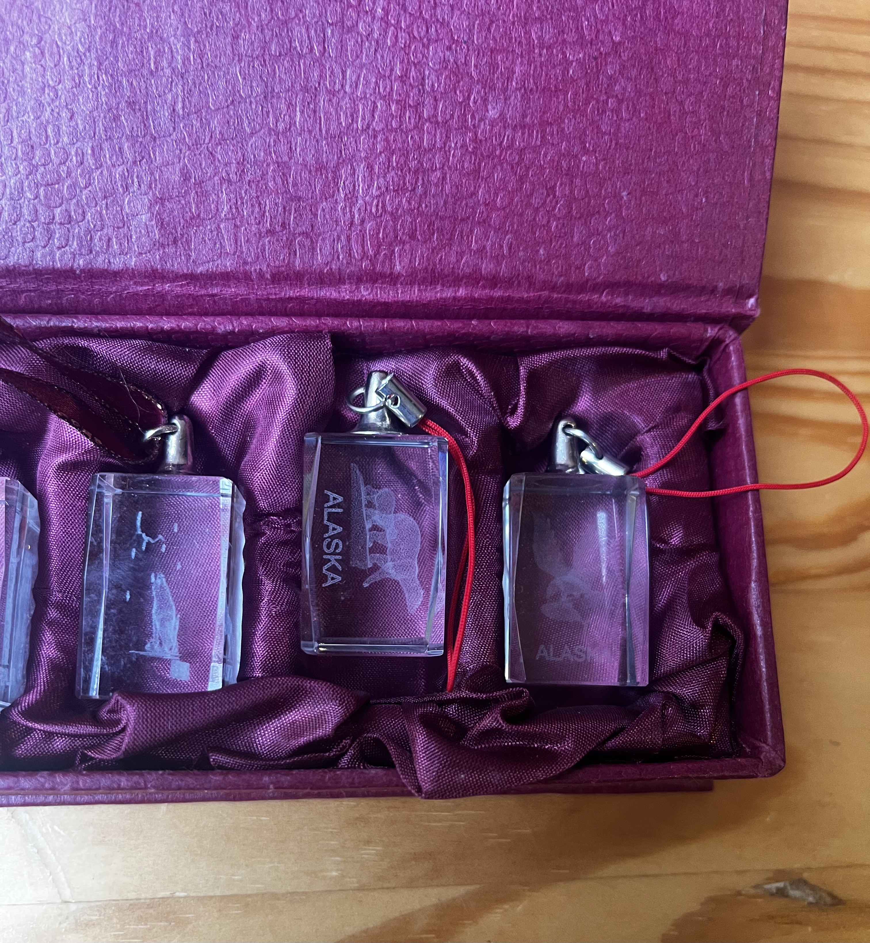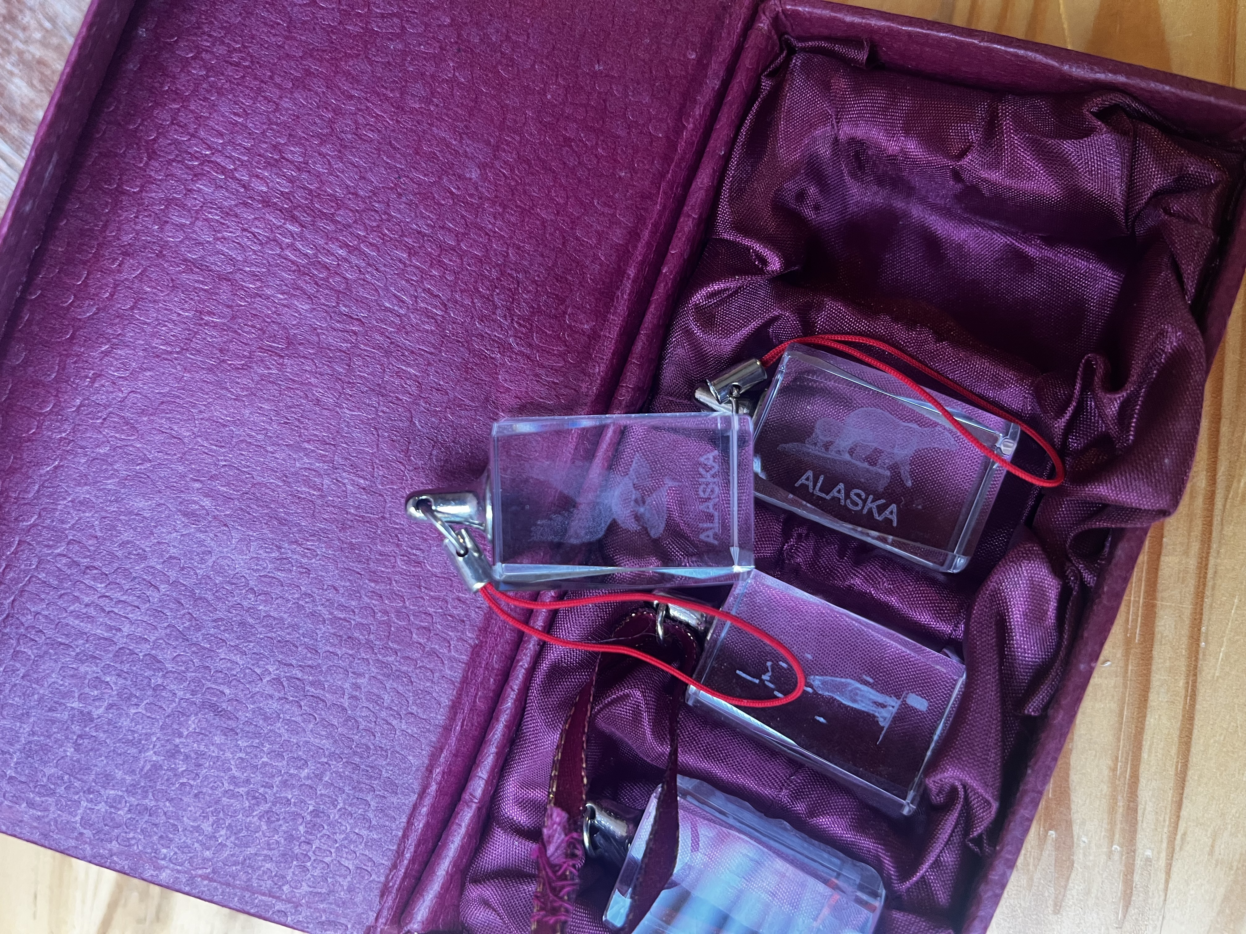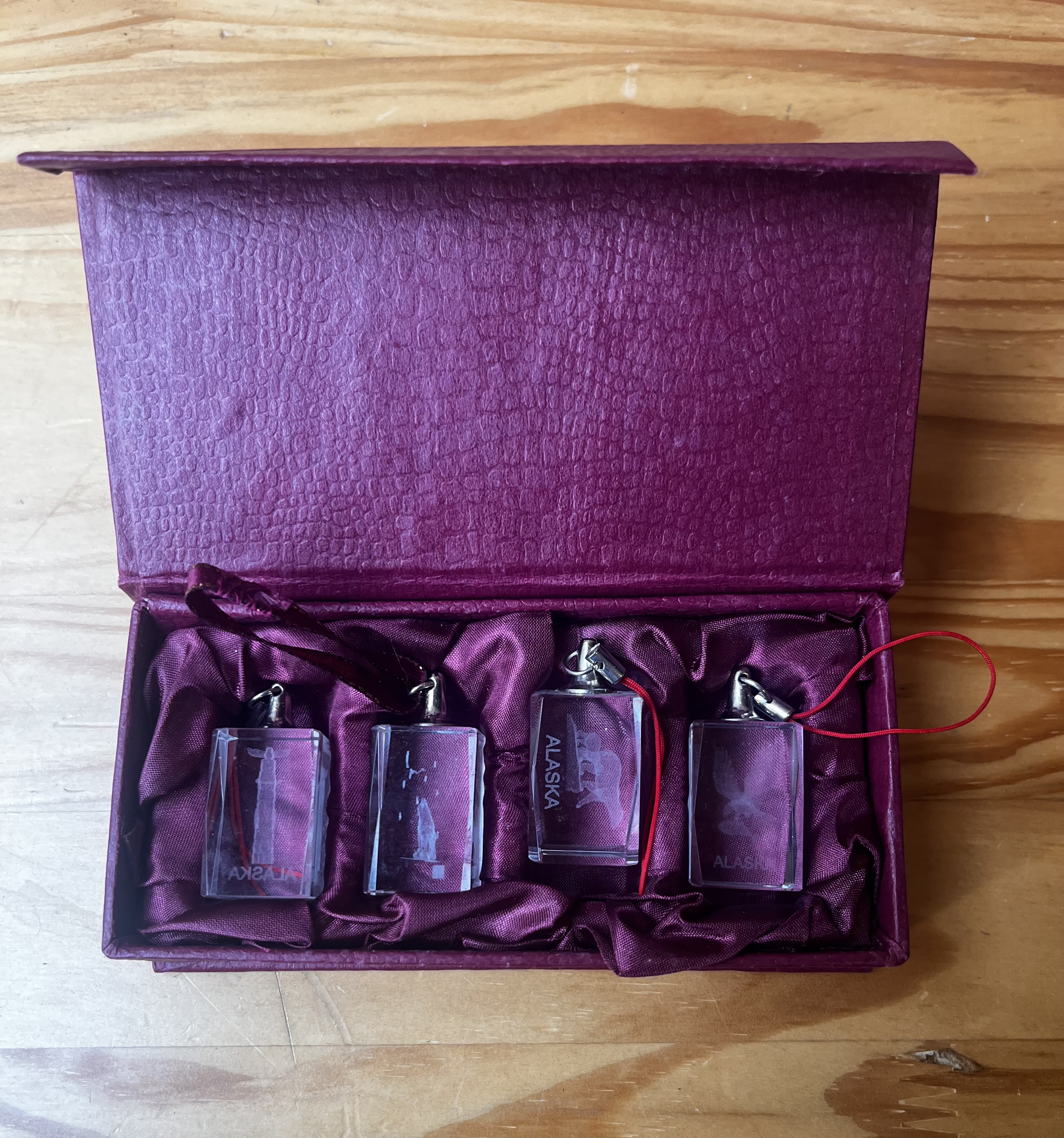 A gift set of four glass (or crystal) keychains, each engraved with the word “ALASKA.” The keychains are presented in a purple textured display box with a satin-lined interior, making them an attractive souvenir or collector’s item.