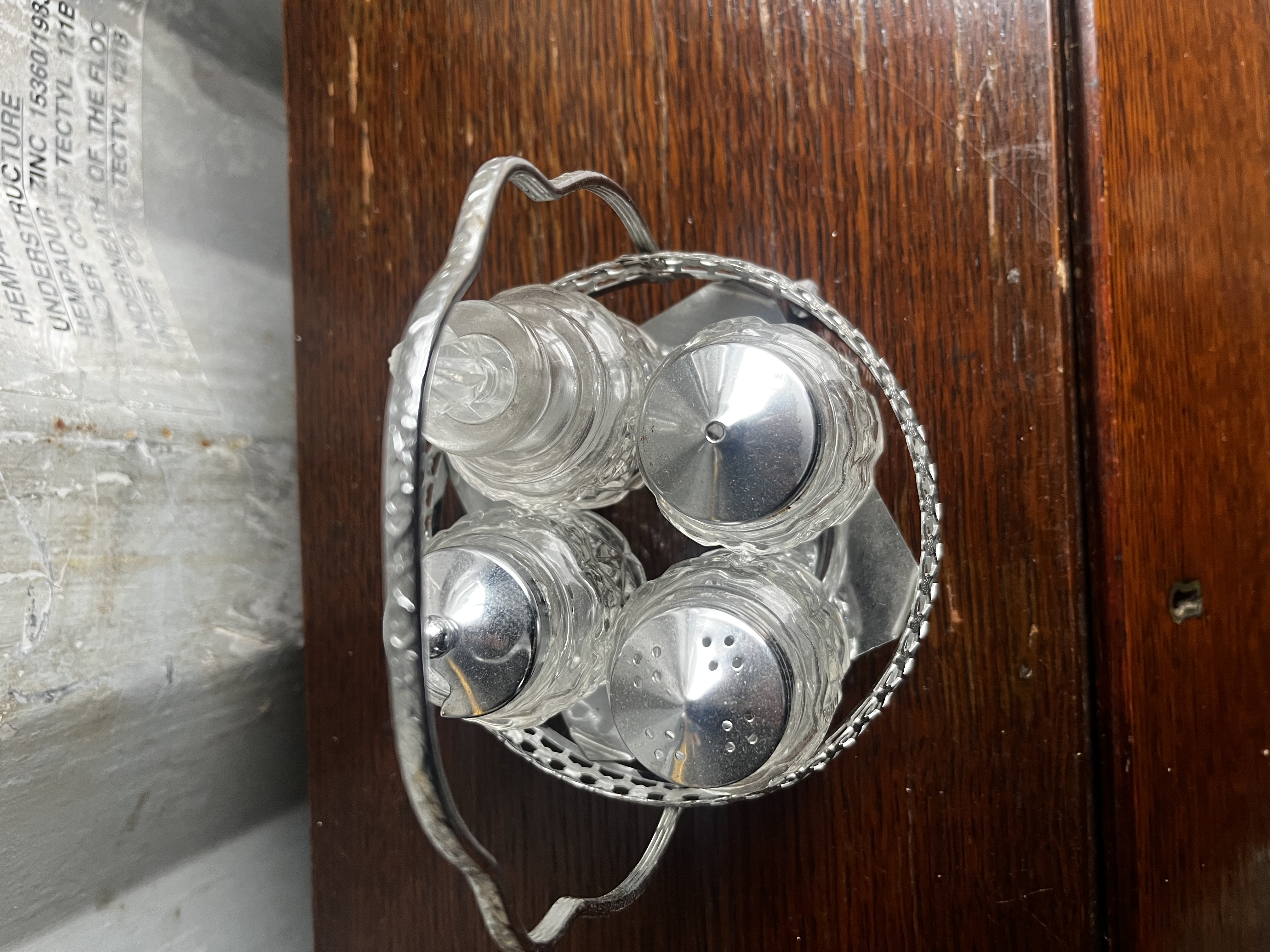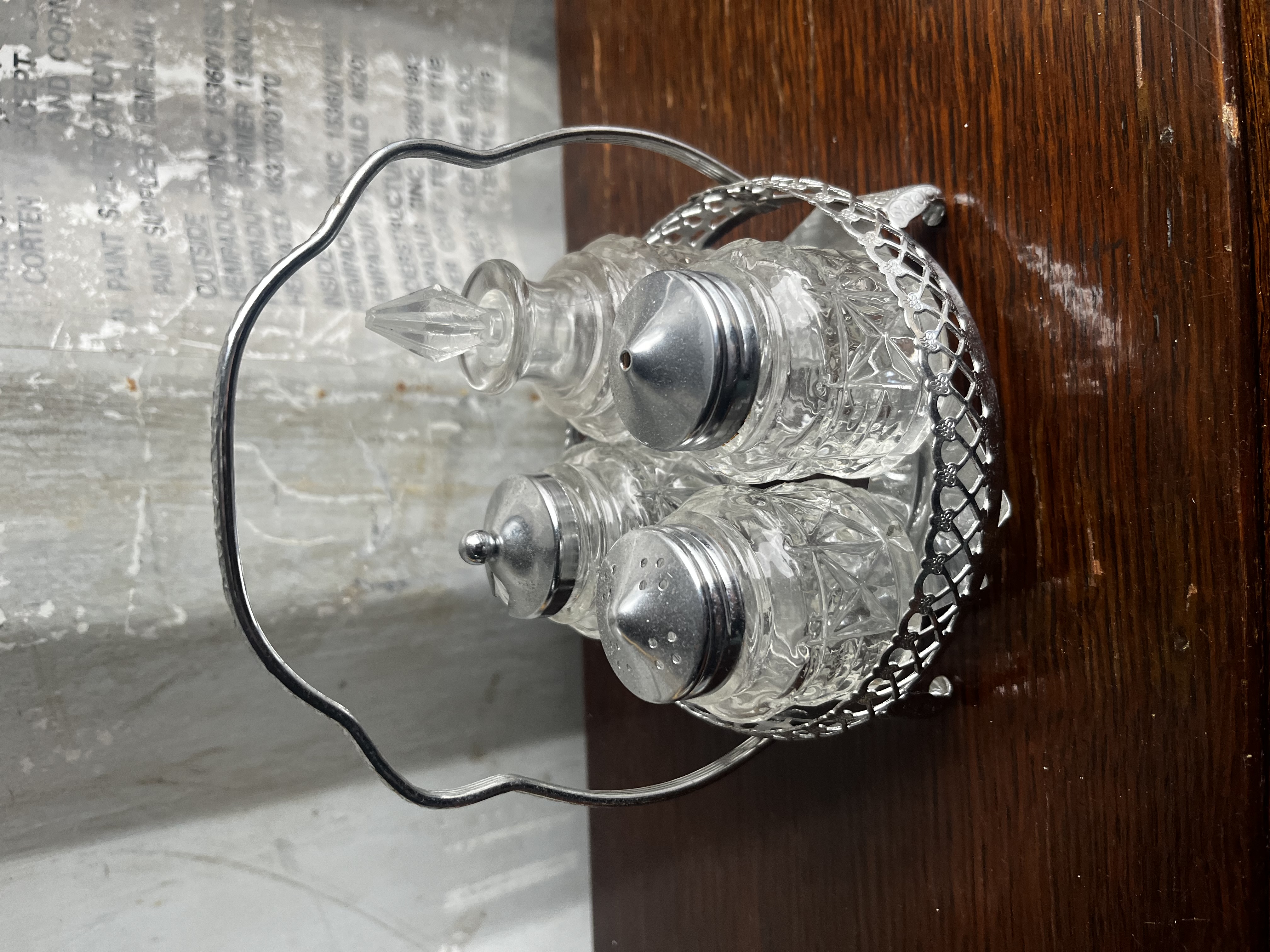 featuring cut-glass containers for salt, pepper, oil, and vinegar