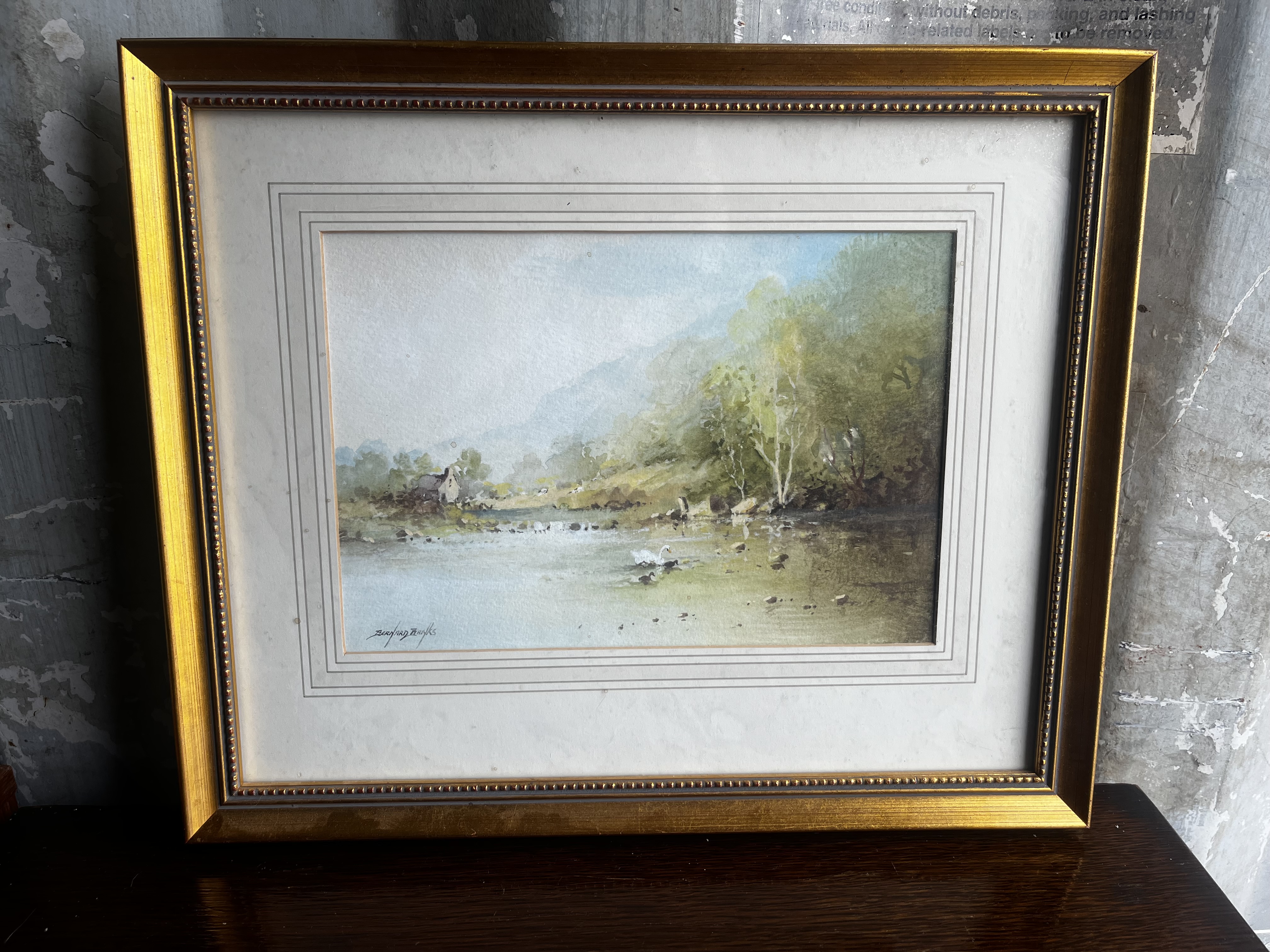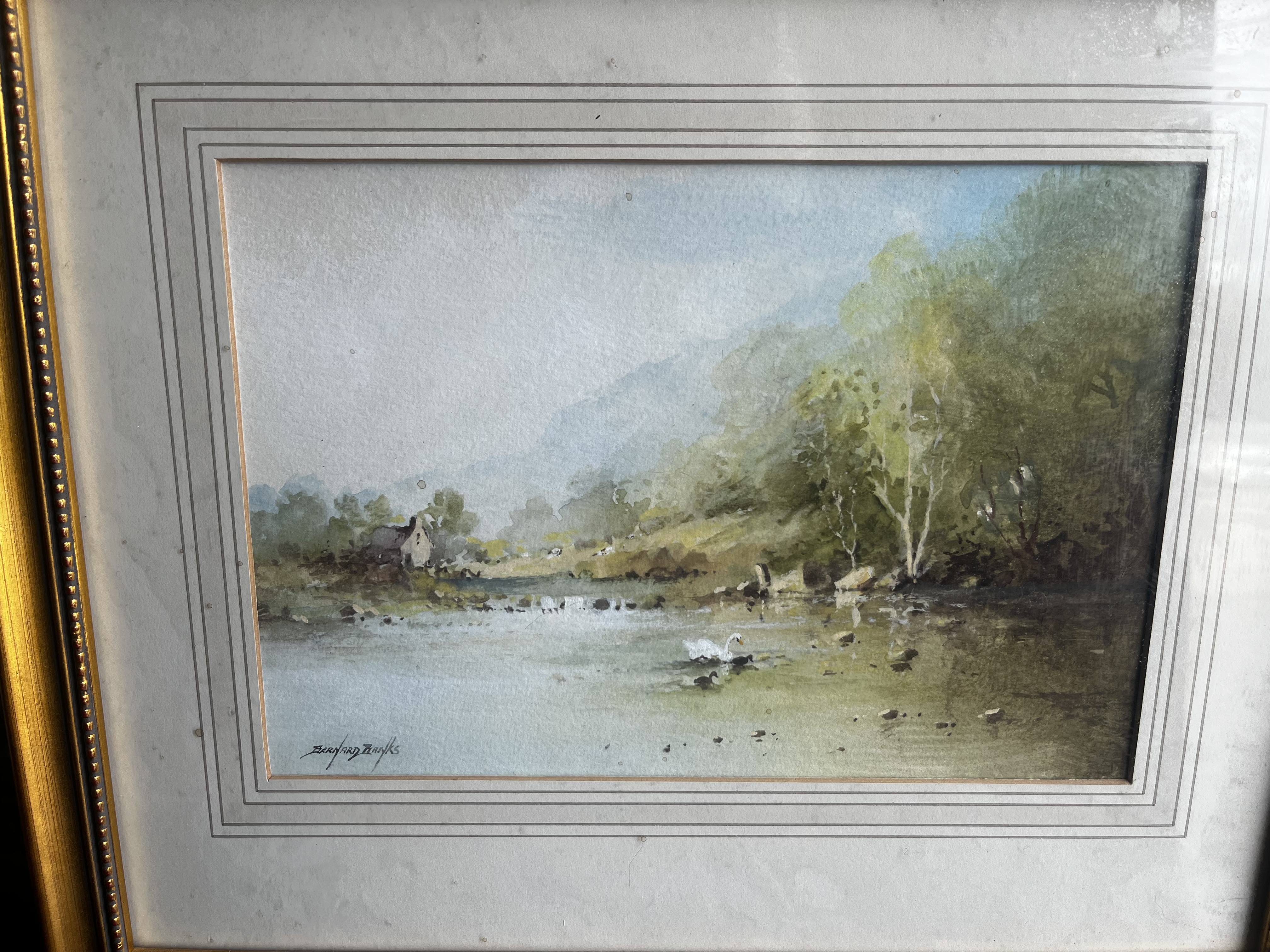 A charming original watercolour painting signed Bernard Franks, depicting a tranquil countryside scene featuring a small cottage beside a calm river or lake, framed by trees and gentle hills in the distance. The artist’s signature appears clearly in the lower left corner.