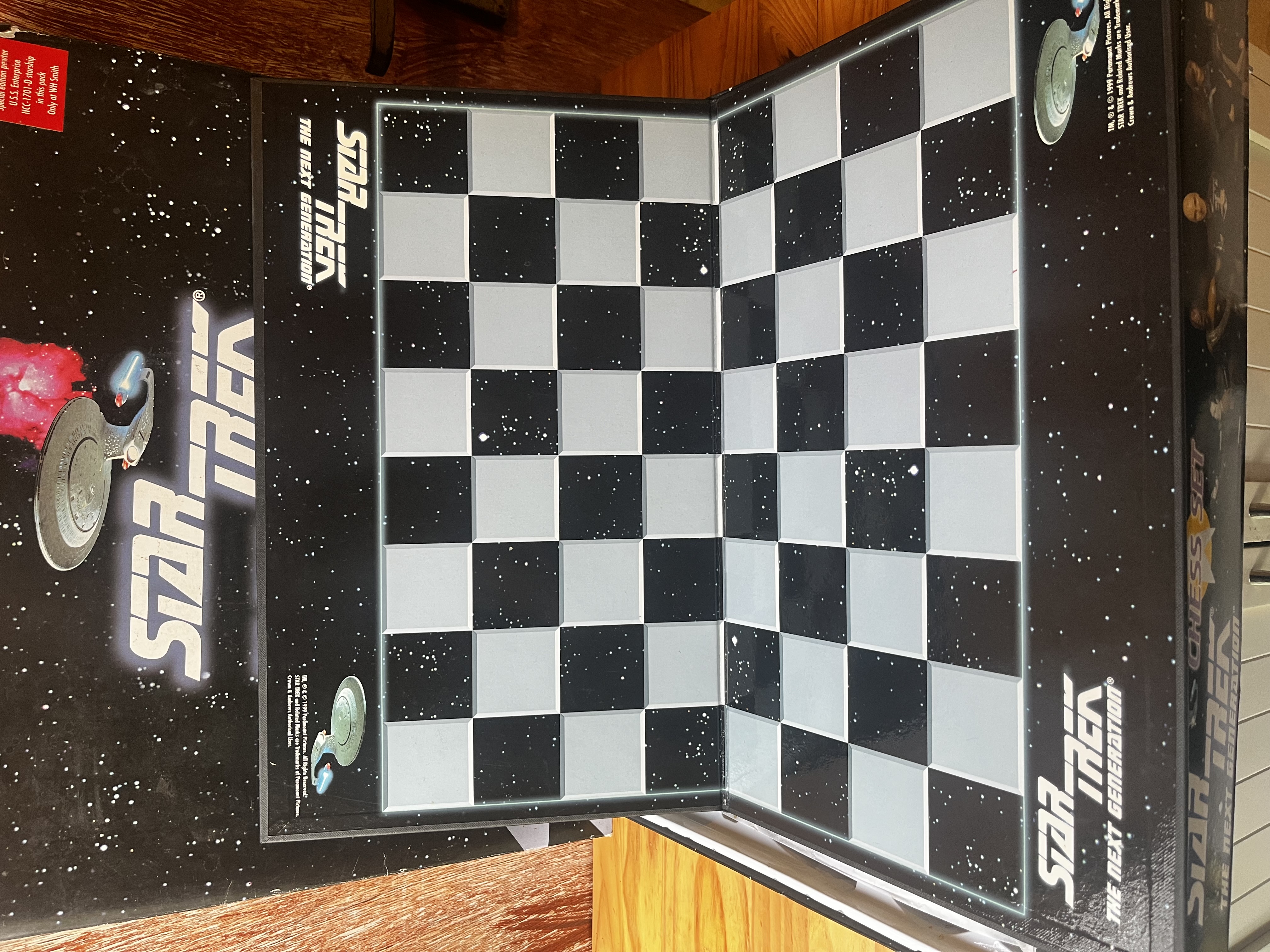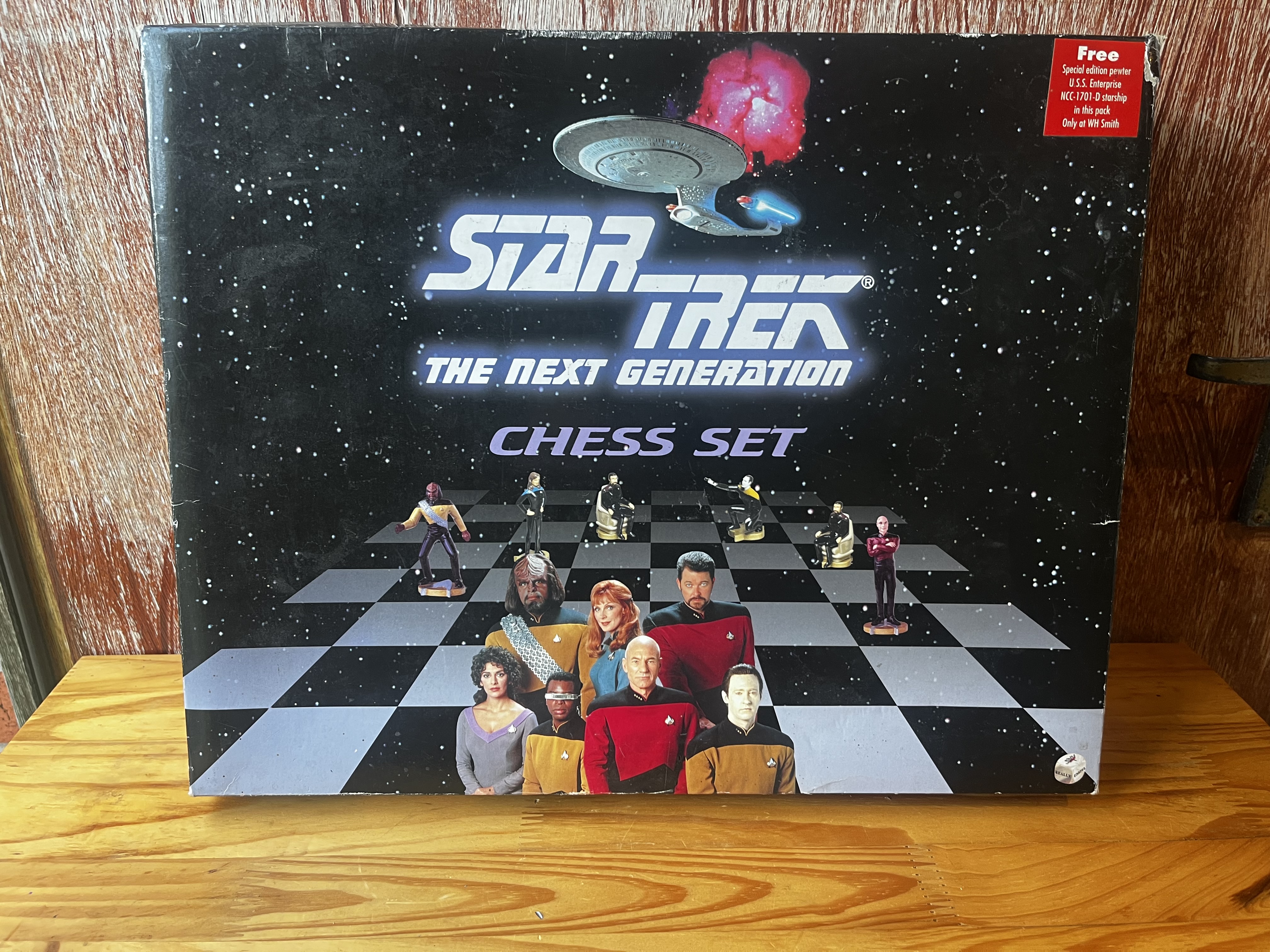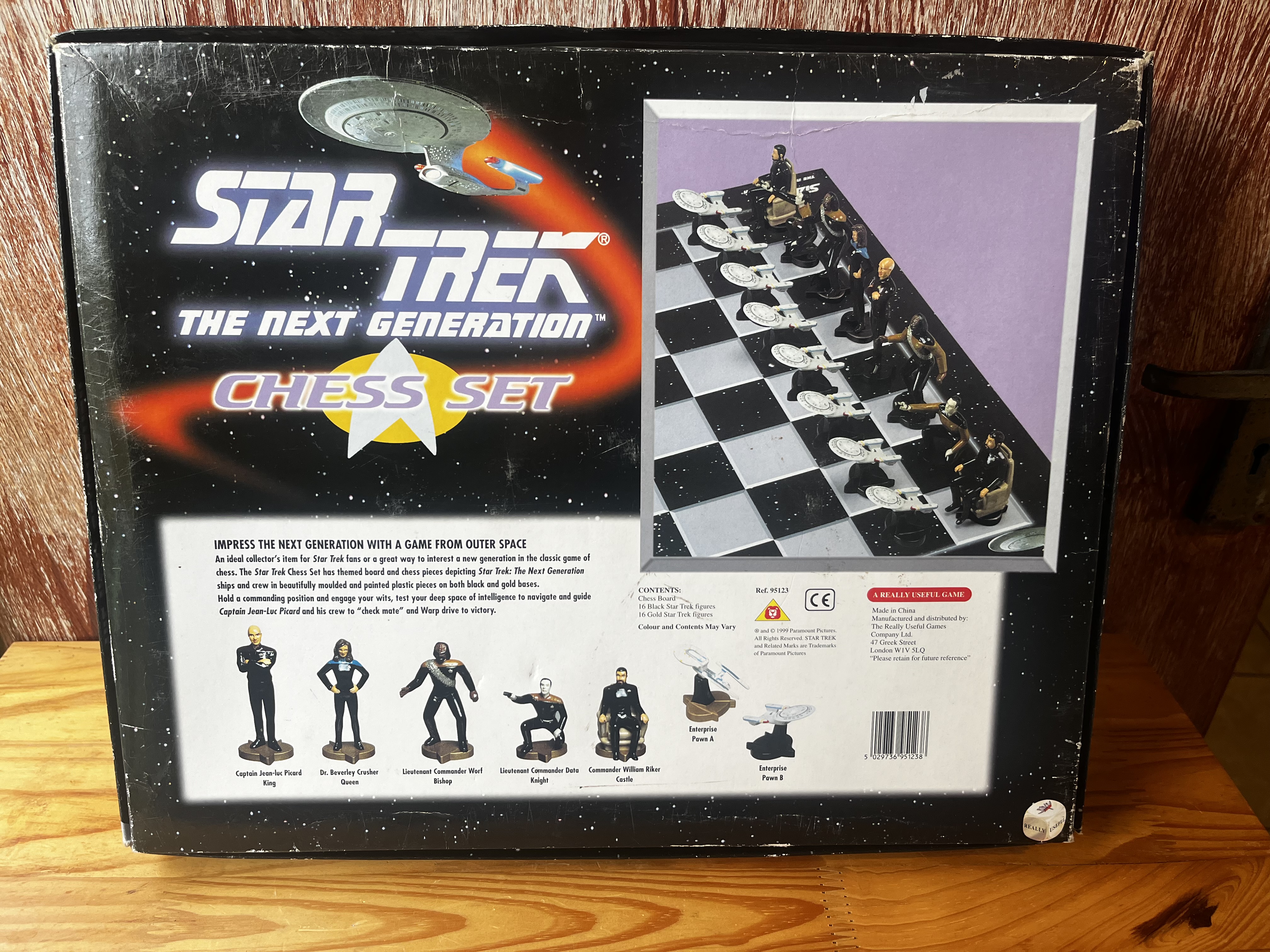 Fully Complete & in good vintage boxed condition with original instructions – A vintage 1999 Star Trek: The Next Generation chess set by Crown and Andrews, featuring painted plastic character pieces from the iconic TV series, each mounted on black or gold bases.