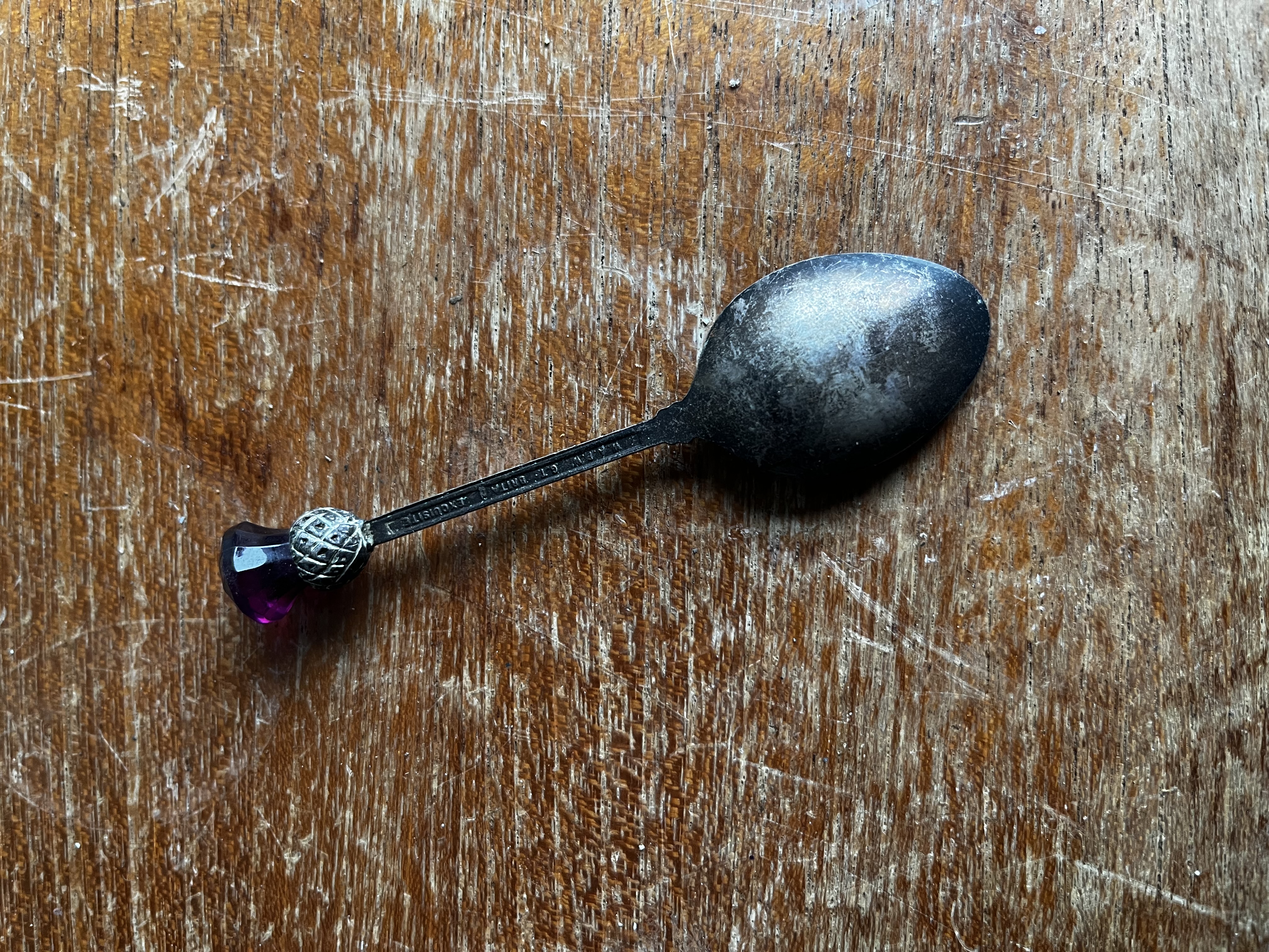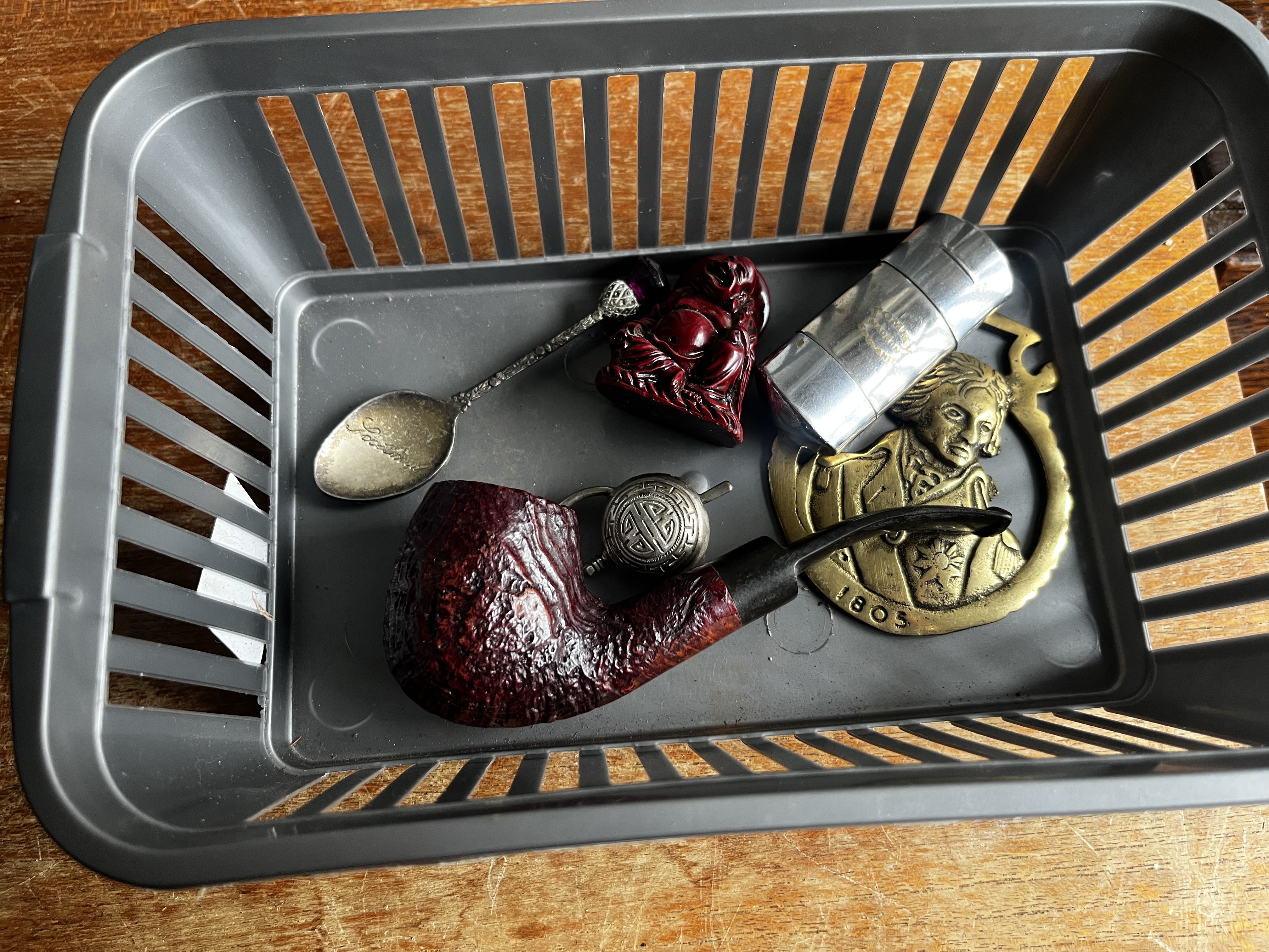 Lot 227: Tray of small collectable items including pipe, Chinese lock, Scottish thistle spoon & more